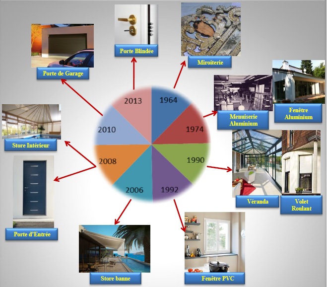 De 1964 à 2013, l’Entreprise a su s’adapter aux évolutions des marchés en rajoutant des activités toujours en adéquation avec le métier de base de la Société. La menuiserie Aluminium et la miroiterie sont le coeur de métier de la Société mais les fenêtres PVC et tous les autres produits du second oeuvre du bâtiment ne pouvaient pas être mis de côté, d’autant plus que la demande de la part des clients est là. Depuis 10/15ans, les clients ne souhaitent plus avoir plusieurs interlocuteurs pour la réalisation de leur chantier d’où la nécessité de s’adapter en se diversifiant.